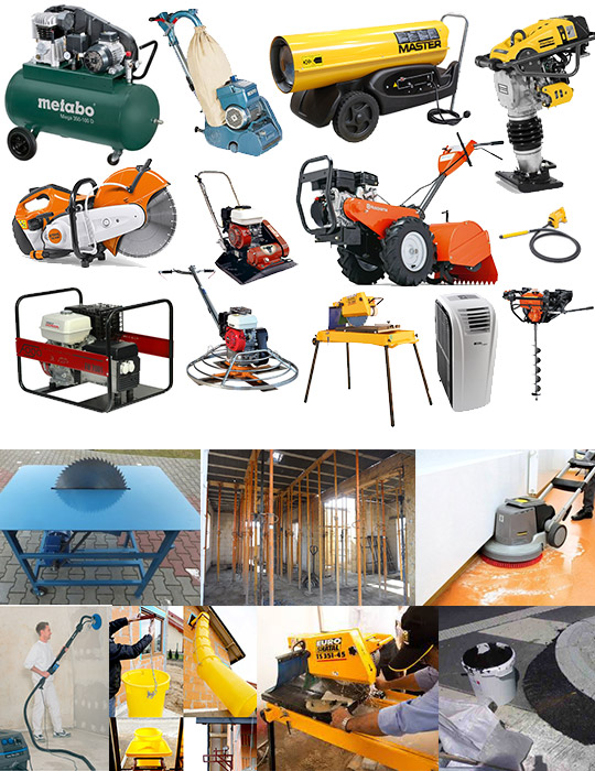 W swojej ofercie posiadamy,.przecinarki stołowe z ruchomym stołem również do ciecia na mokro- średnica tarczy 350 mm. Doskonały sprzęt do precyzyjnego cięcia płytek glazury i innych materiałów ceramicznych również pod kątem do 45 stopni, zagęszczarki gruntu, zacieraczki do betonu, cykliniarki, agregaty prądotwórcze jedno i trójfazowe (również z modułem spawalniczym), betoniarki, piły łańcuchowe, spalinowe wiertnice glebowe, młoty wyburzeniowe, młoty udarowo-obrotowe, glebogryzarki spalinowe samobieżne,areatory/wertykulatory, nozyce do żywopłotu spalinowe, nagrzewince, łaty wibracyjne, zagęszczarki(wibratory) do betonu, zacieraczki do gipsu (żyrafa), piły do cięcia betonu i krawężników, elektryczne szlifierki do betonu i frezarki do tynku, bruzdownice do wycinania w ścianie przejść pod kable,nożyce elektryczne do cięcia blachy (grubość do 2 mm), piły posuwisto-zwrotne (tzw.lisi ogon) np. do wycinania starych futryn, cięcia drewna z gwoździami,mocne myjki ciśnieniowe oraz odkurzacze piorące,osuszacze powietrza, otwornice do betonu (ze statywem), otwornice do gniazdek elektrycznych,niwelatory laserowe ze statywem i łatą, wyciagarki elektryczne na budowę (250-500 kg), palniki do papy, zakryte przyczepki samochodowe, zestawy rusztowania warszawskiego do drobnych prac monterskich, naprawczych lub ogólnobudowlanych oraz stemple metalowe regulowane w zakresie 2m-3,6 m, zsypy budowlane długość zestawu 10m, hydrauliczne spalinowe łuparki do drewna, polerki/szorowarki do podłóg.